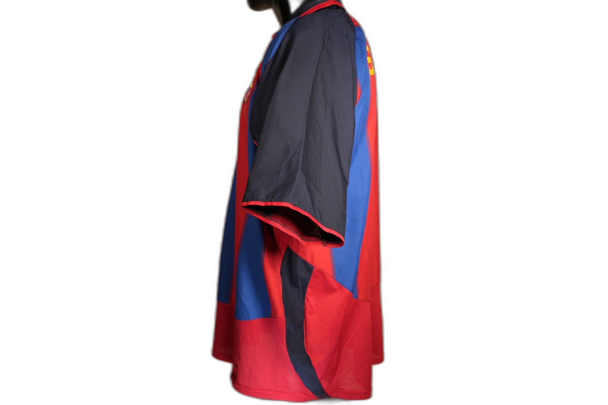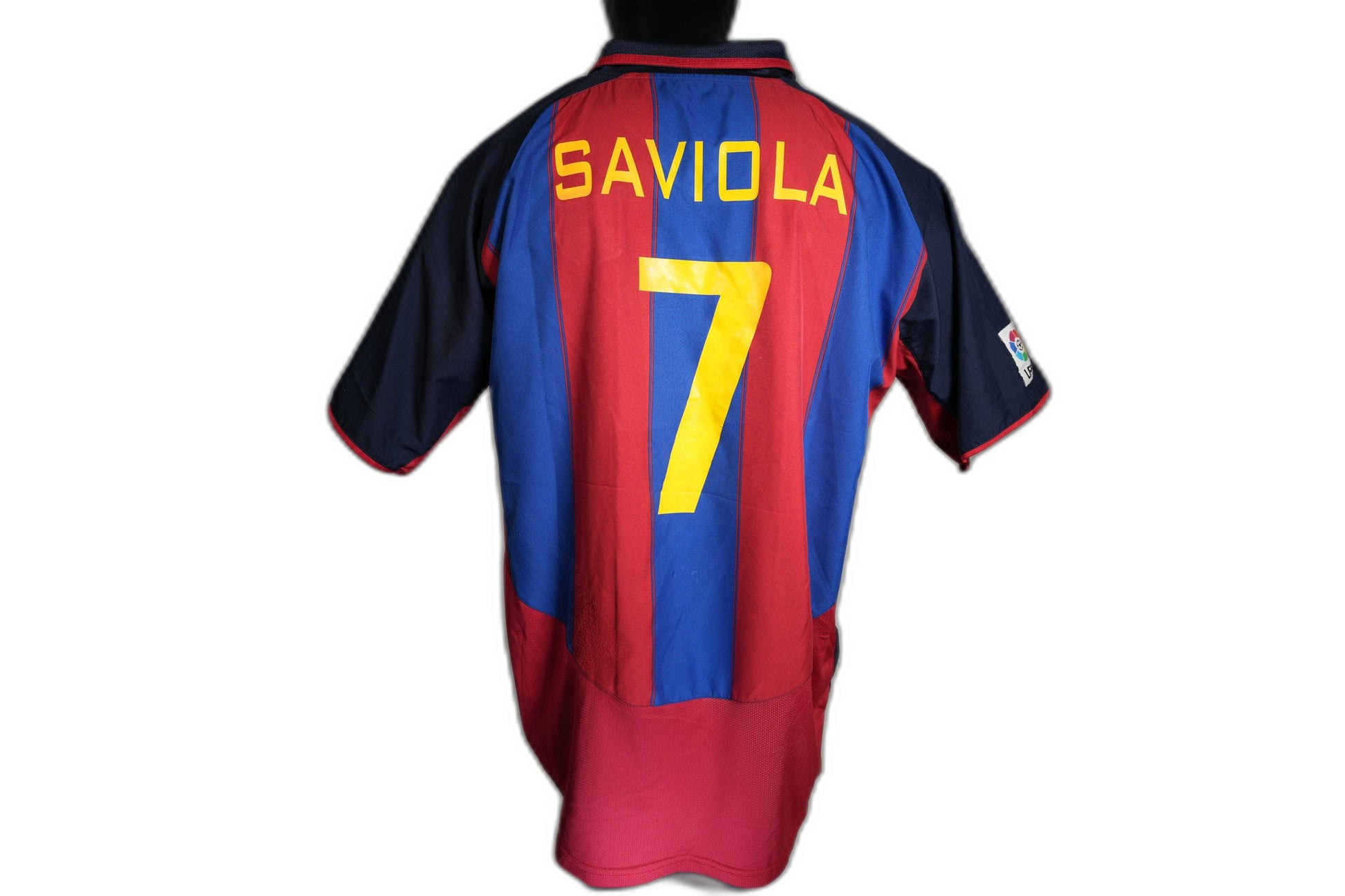 Camiseta local del FC Barcelona 2003-2004, talla XXL. Esta camiseta Nike roja y azul con SAVIOLA 7 en la espalda recuerda a la temporada 2003/04, cuando el Barça no ganó ningún título importante pero aun así jugó un papel importante en la liga. ¡Un pedazo de la historia del fútbol para coleccionistas!