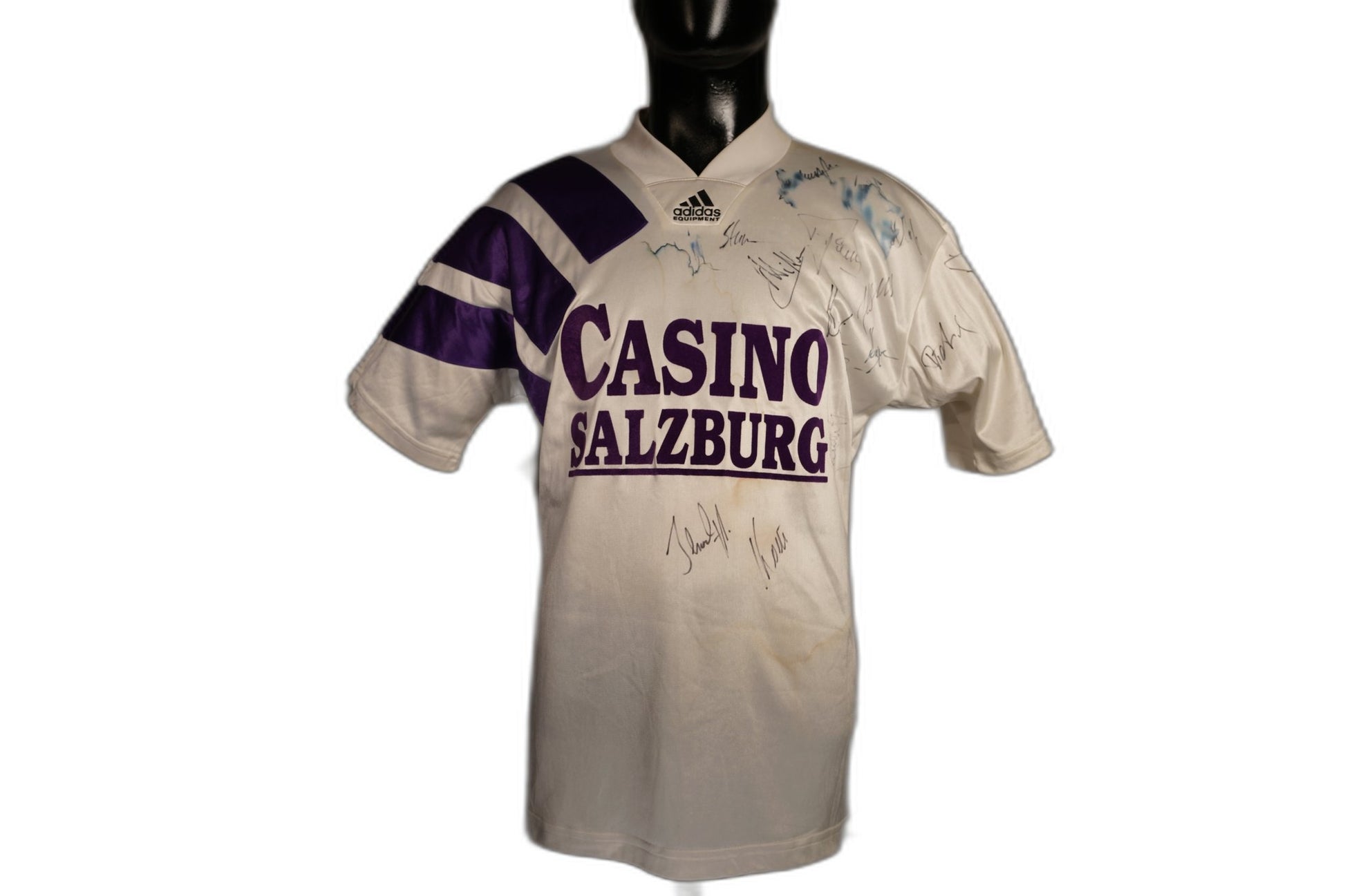 Austria Salzburg Heim Trikot aus der Meister Saison 1994-1995 von Heimo Pfeifenberger mit der Nummer 19. Dieses möglicherweiße Matchworn Trikot von Pfeifenberger mit allen Unterschriften der Mannschaft ist ein Stück österreichischer Fußballgeschichte.