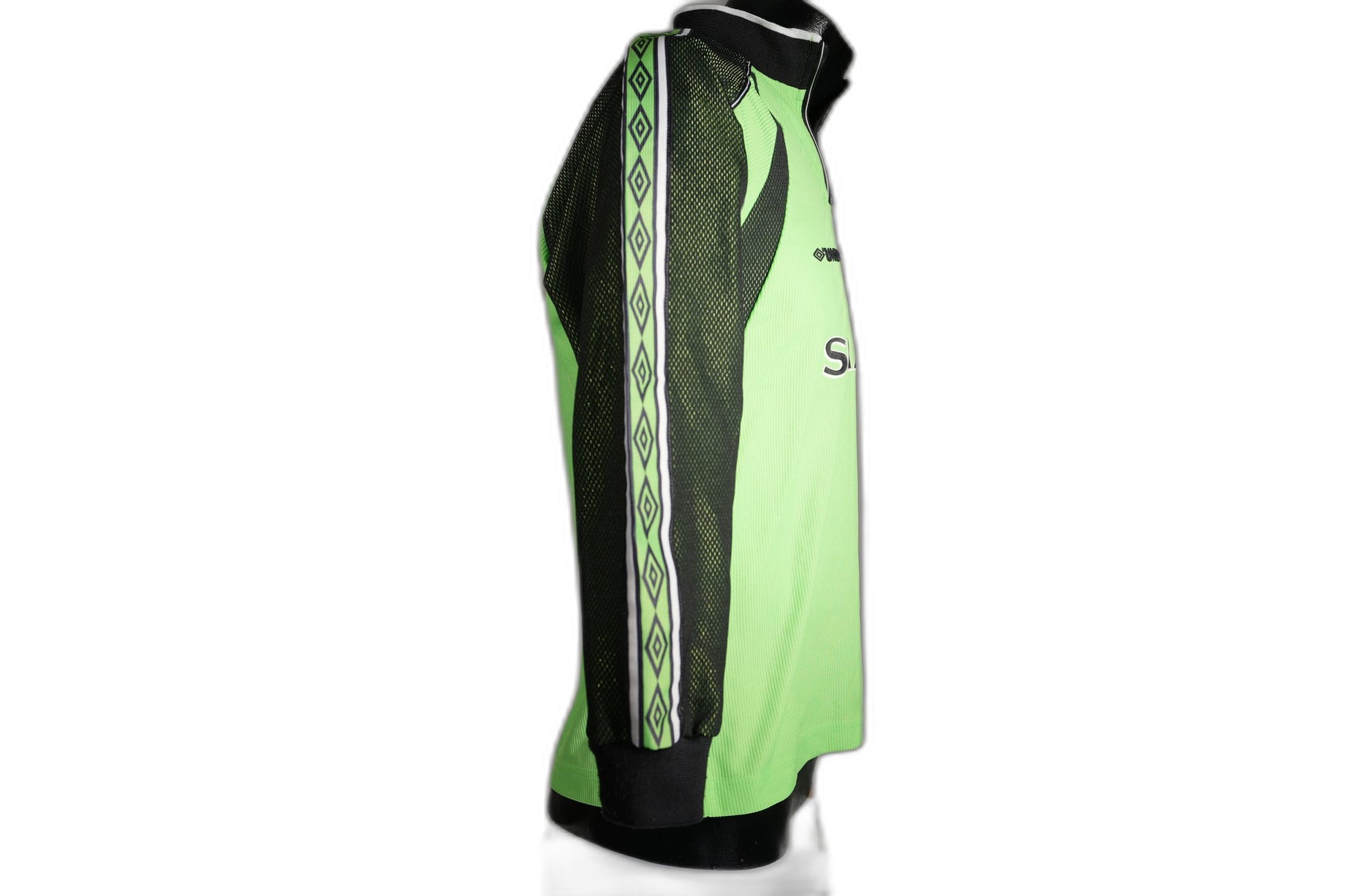Manchester United Umbro Torwart-Trikot 1998-1999 - Gr. L (158, 12-13 Jahre) - Neongrün/Schwarz. Dieses Langarm-Trikot ist eine originalgetreue Kinderversion (entspricht Erwachsenengröße XS) und erinnert an die Saison 1998/99, in der Manchester United das Triple aus Premier League, FA Cup und Champions League verpasste. Die Reds erreichten das Champions League Finale, welches sie gegen Bayern München verloren. Ein Sammlerstück für junge Fans der Red Devils!
