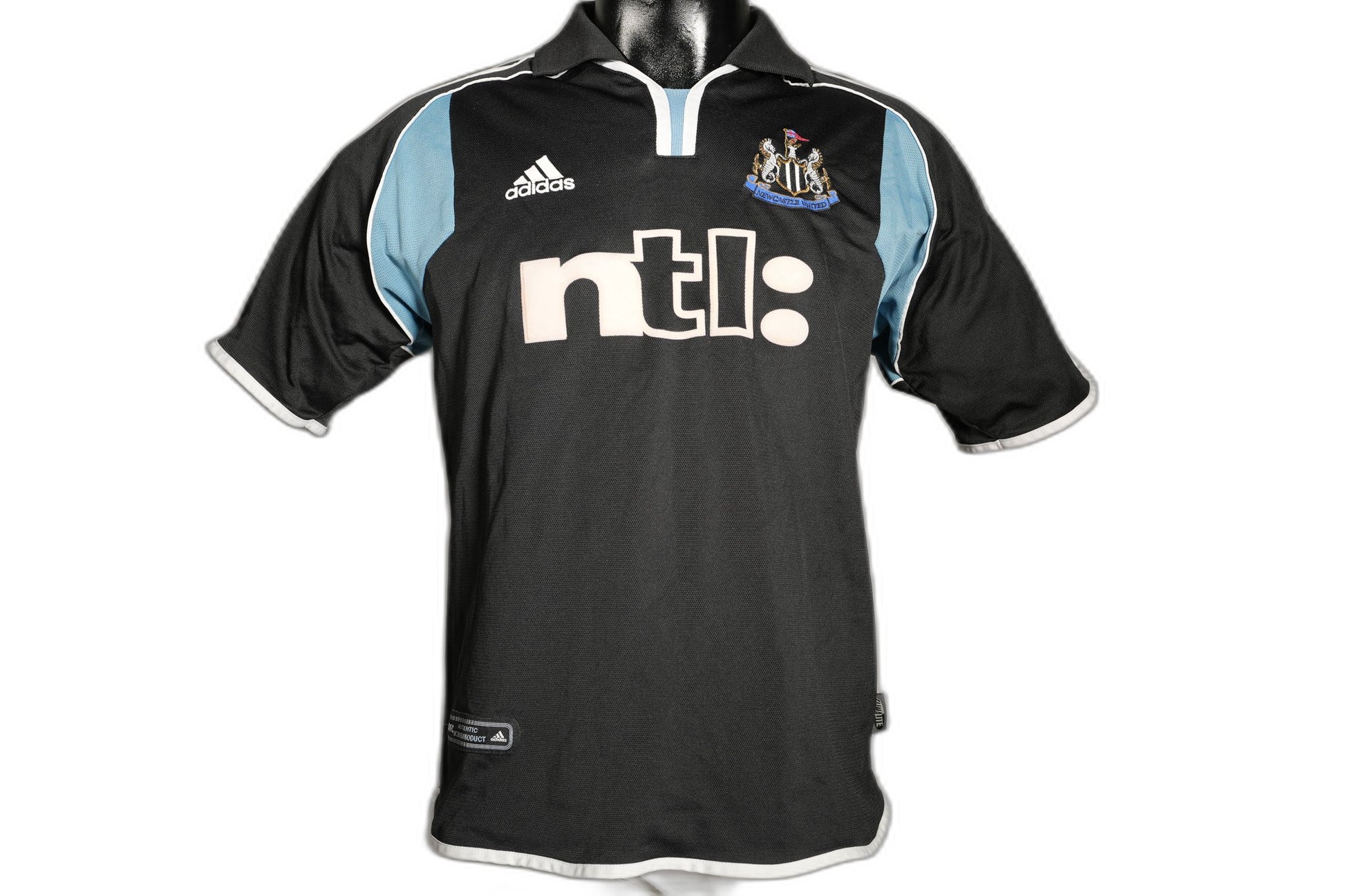 Newcastle United Auswärtstrikot 2000-2001 (Adidas) - Größe M. Schwarzes Trikot mit blauen und weißen Details. In der Saison 2000/01 erreichte Newcastle mit diesem Trikot den 11. Platz in der Premier League. Ein Stück Fußballgeschichte für Sammler!