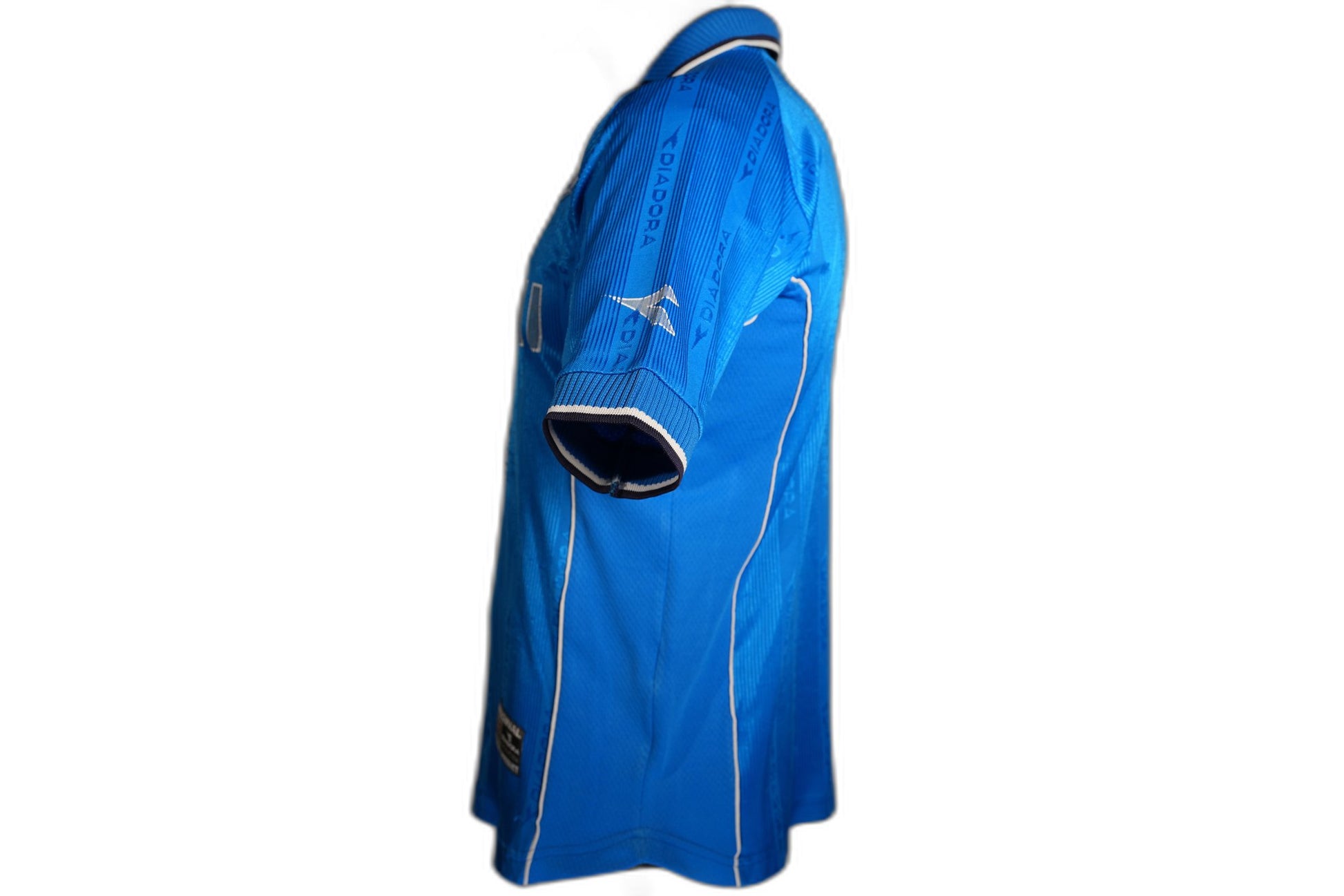 SSC Napoli Heim Trikot von der Saison 2000-2001. In diesem Jahr schaffte Napoli den Wiederaufstieg in die höchste italienische Spielklasse, nachdem der Club einige Jahre in der Serie B verbracht hatte. Napoli musste in dieser Saison den Wiederabstieg in die Serie B antreten, nachdem ein Sieg gegen Fiorentina am letzten Spieltag annuliert wurde.