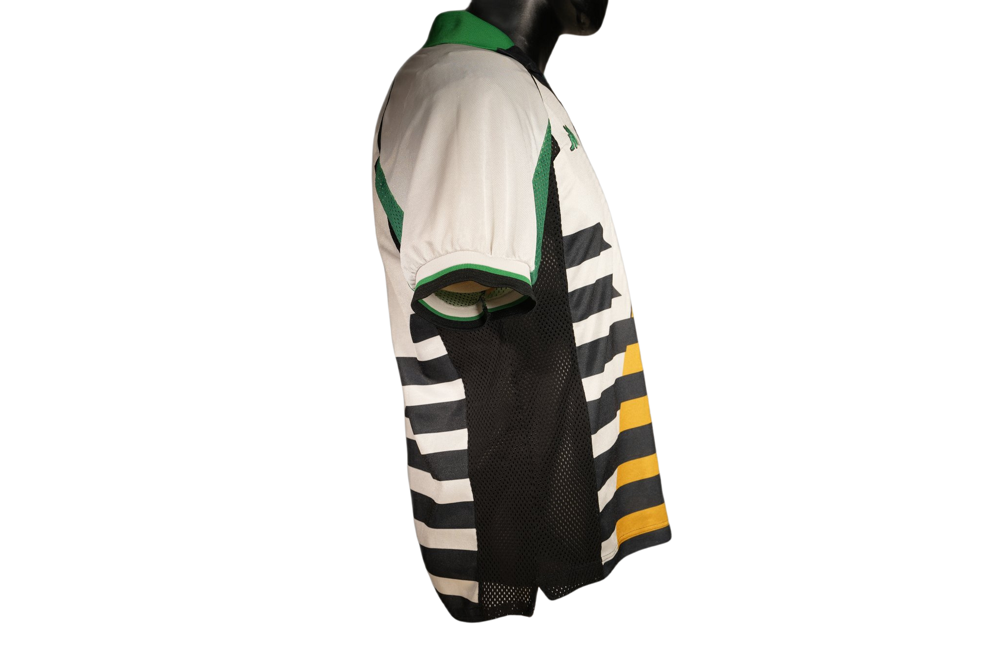 Seltenes Südafrika Heim Trikot aus dem Jahr 1998-1999 mit speziellem Design. Südafrika spielte mit diesem Trikot bei der Weltmeisterschaft 1998 in Frankreich, in welcher sie bereits in der Gruppenphase gegen Frankreich und Dänemark gemeinsam mit Saudi Arabien die verfrühte Heimreise antreten mussten.